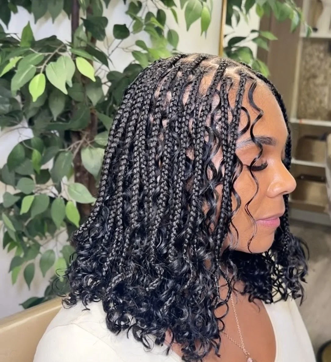 This style combines traditional knotless with our soft curls creating a chic bohemian look. It’s perfect for vacations, festivals or everyday glam. Our bundles are included in this service.