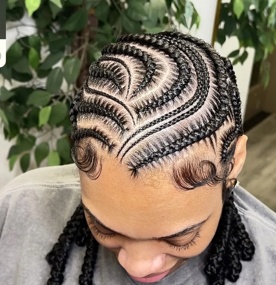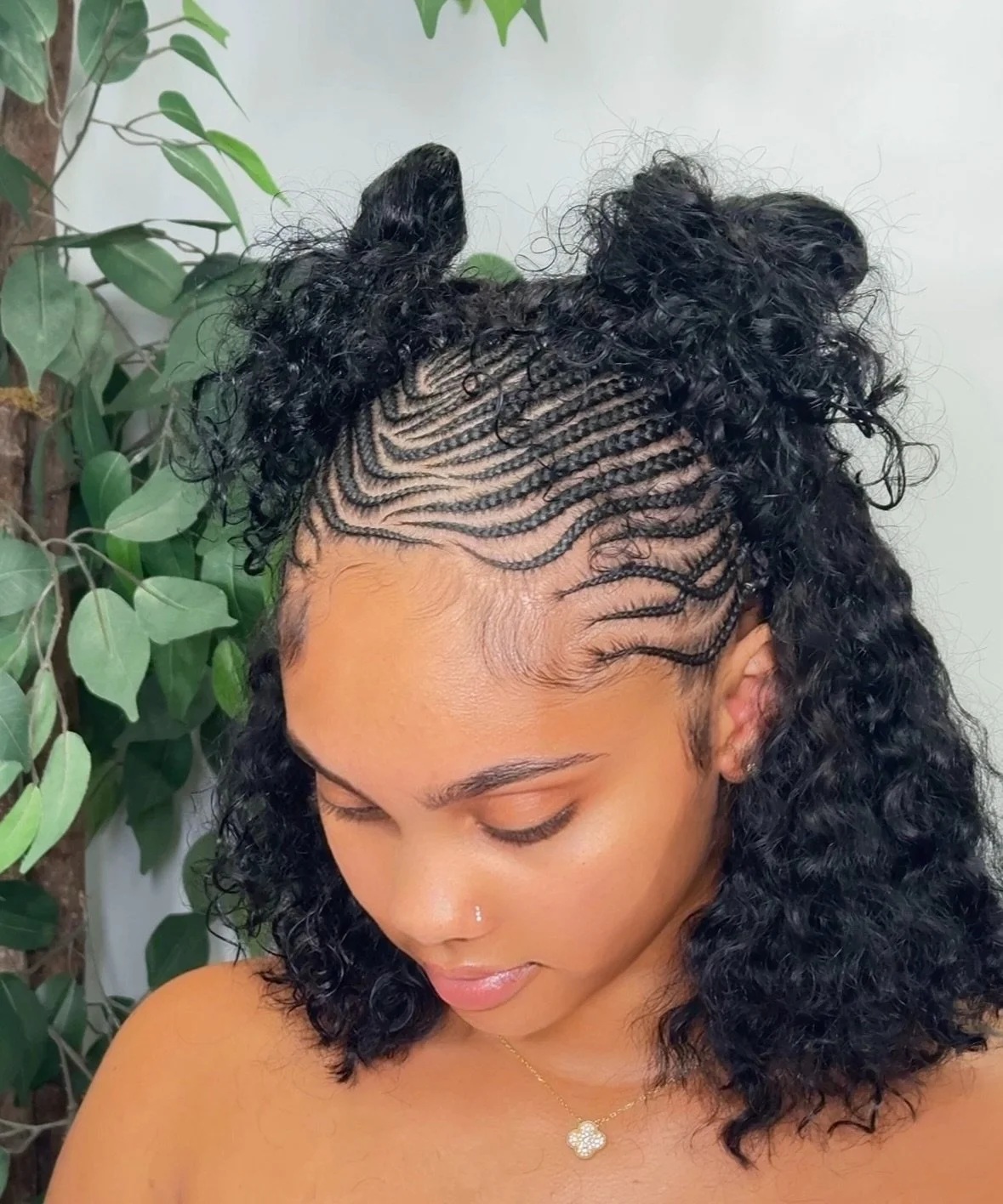 This signature style blends the elegance of Fulani braids with the versatility of a sew-in / quick weave for a flawless, natural-looking finish. The front features intricate tribal-inspired braiding with clean, detailed parts , while the back is completed with soft, voluminous curls for added fullness and bounce. Perfect for those who want a protective style with a glamorous twist